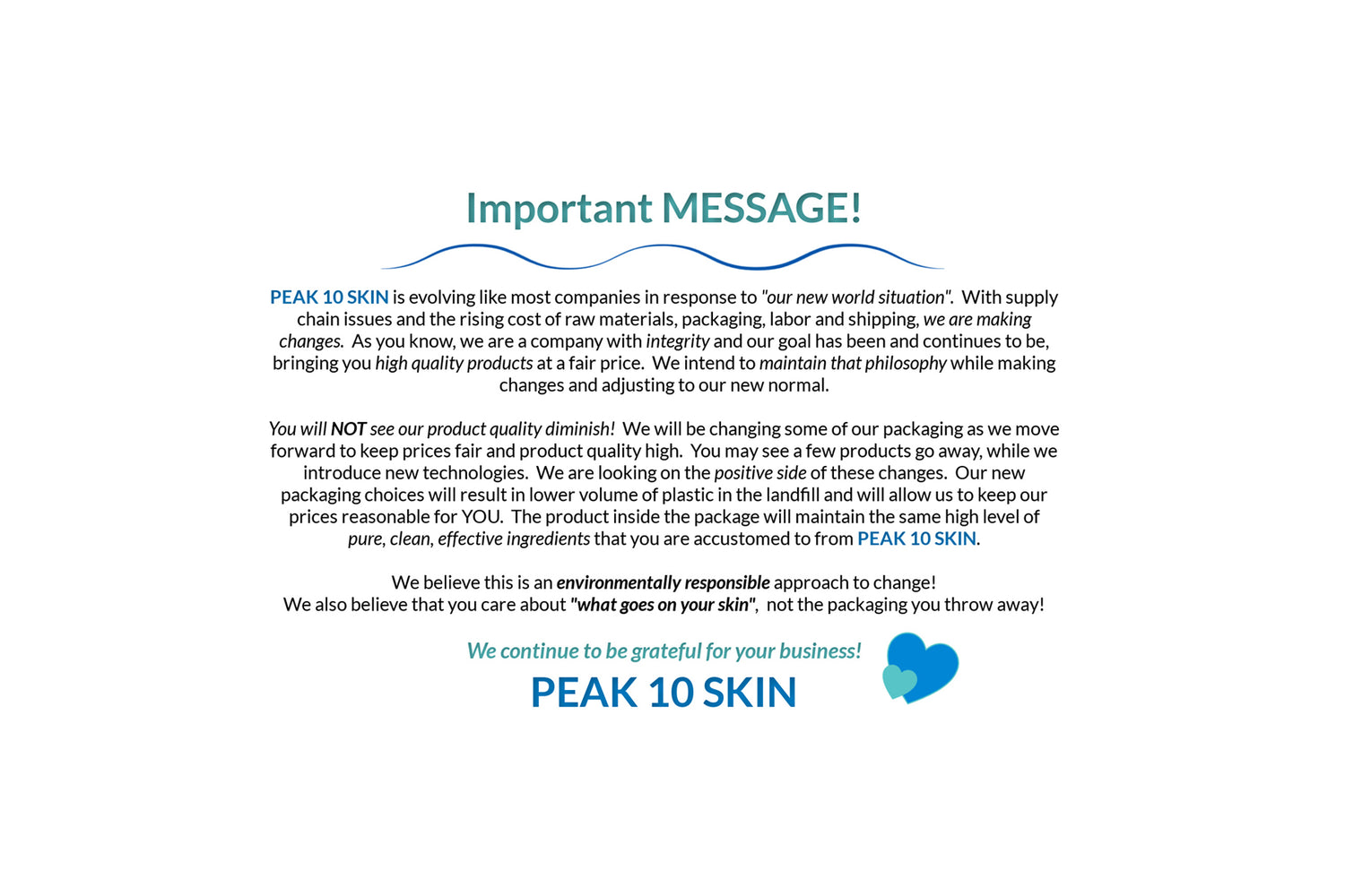 PEAK 10 SKIN® is elevated skincare. Our products contain high levels of active ingredients that are not diluted with lots of fillers. Simply put, we give you more of the ‘good stuff’! In order to achieve healthier, more hydrated and vibrant skin, you need products with ingredients that are known to be effective. If those ingredients are diluted, the results will be as well.